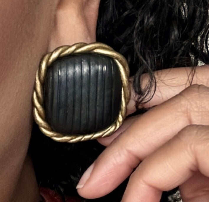 These modern minimalist framed square studs feature a black embossed base with an antique gold twisted frame. Each pair is finished with surgical steel earring posts.