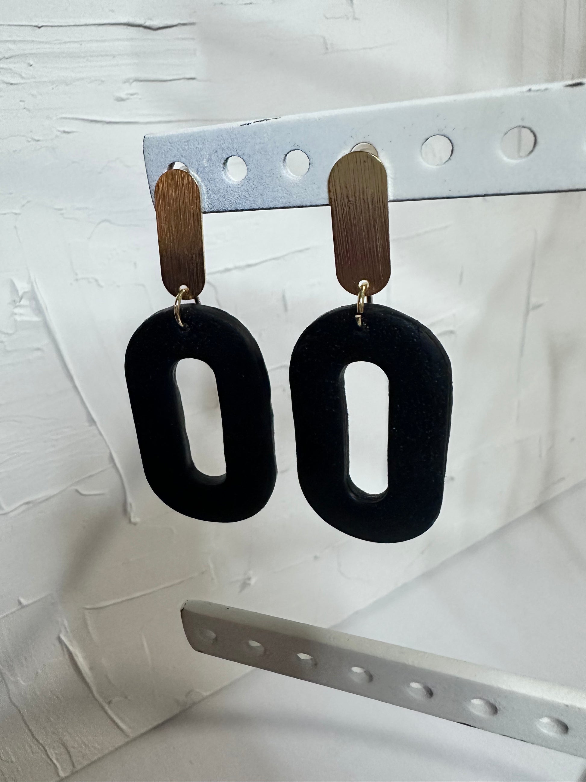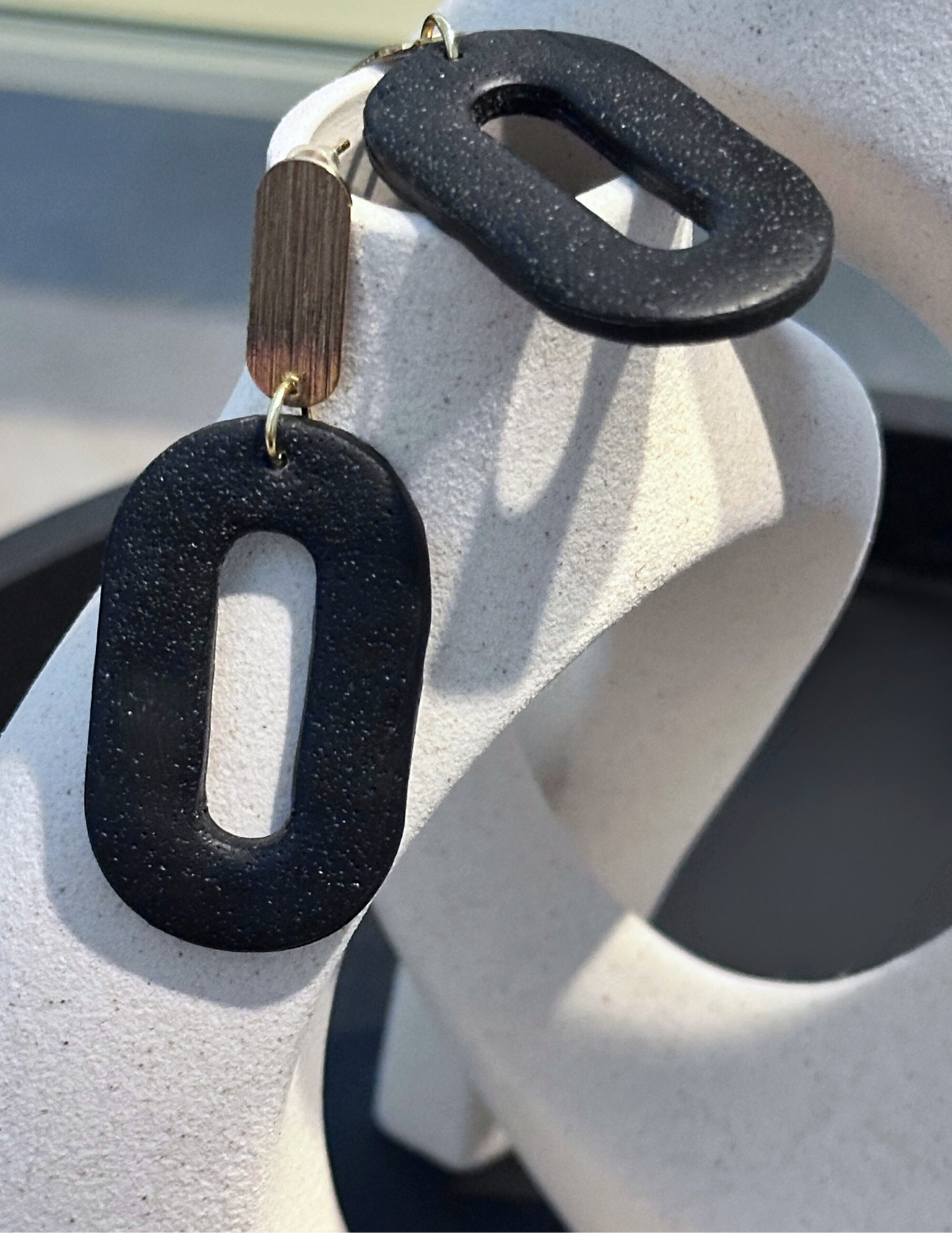 Modern minimalism with organic texture. These Textured Oval Dangle Earrings feature a sleek, elongated shape crafted from polymer clay with a unique matte, sandpaper-like finish. The soft texture adds depth and sophistication, creating a beautiful contrast with the warm glow of the gold-plated brass post.